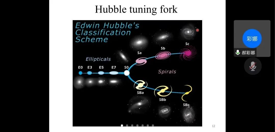 本次学术报告,郝彩娜老师从天体物理学的重要研究领域之一——星系形成与演化研究开始讲起,先后说明了星系的形成机理、形态学、恒星的形成史等。郝老师说到宇宙中星系的颜色和形态紧密相关,并呈两大类分布:大质量星系恒星形成停止导致颜色偏红,并因为拥有较大核球而呈现为椭球形态;小质量星系颜色偏蓝并拥有盘状或者漩涡状形态。