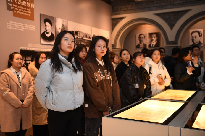 天津法院陈列馆位于天津市高级人民法院院内,为三层近圆形展厅,建筑面积1400平方米,展陈面积2600平方米。在陈列馆的第一层,同学们仔细观看一件件实物展品、一张张珍贵照片、一桩桩真实案例,认真聆听“中国早期法制教育”“中国最早的法院雏形”等天津无数个全国司法的“第一”,对天津这座求学城市的司法文化赞叹不已。