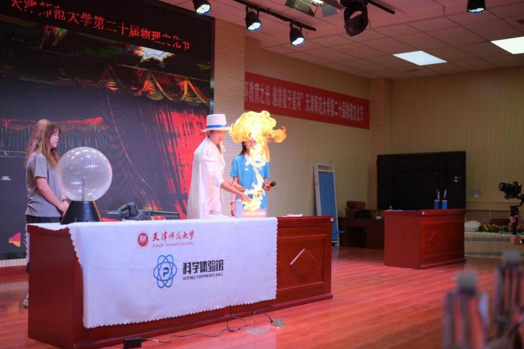 科普秀现场更是将礼堂变为奇幻剧场。实验员手掌浸肥皂水后点燃,蓝色火焰腾起却不伤皮肤,巧妙诠释“蒸发吸热” 原理;辉光球内紫色电弧随指尖舞动,直观展现静电场的奇妙;“看见声音” 实验中,激光笔在震动的气球膜上投射出跳动光点,将抽象声波具象化,引得全场惊叹。