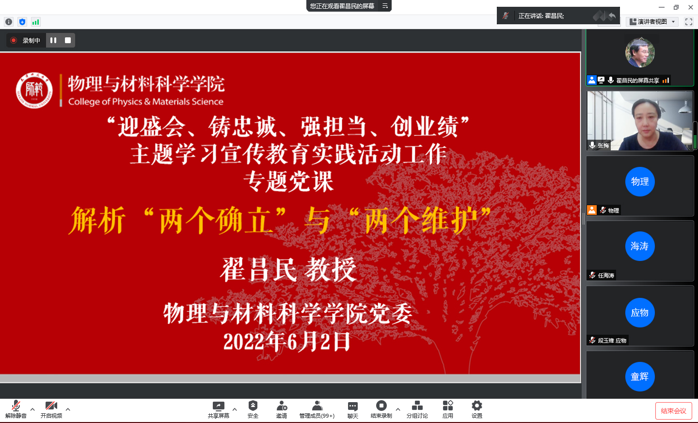 6月2日下午,物理与材料科学公司党委邀请学校关工委报告团成员、政治与行政学院教授翟昌民作题为《解析“两个确立”与“两个维护”》专题党课。学院全体教职工和员工党员在线上聆听。会议由公司党委书记张梅主持。