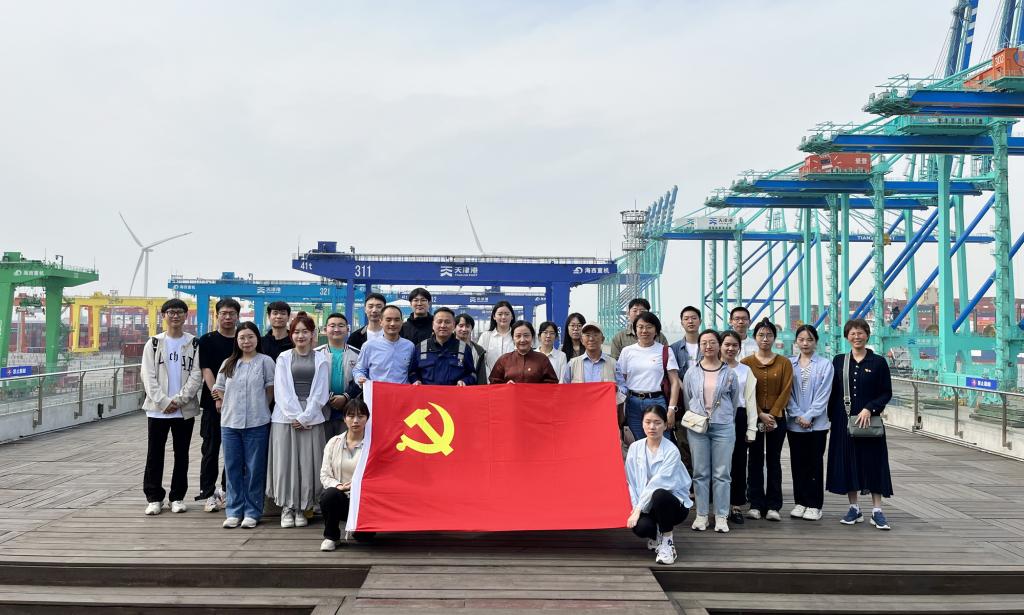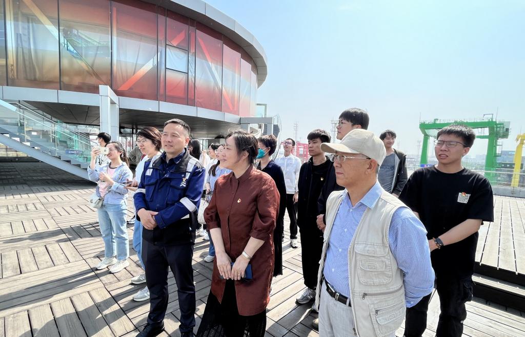在天津港集团,师生党员跟随集团公司领导来到第二集装箱公司七彩廊道参观学习,认真聆听了第二集装箱公司的详细讲解,深刻体悟了天津港忠诚践行习近平总书记重要指示精神,全力打造全球首个“智慧零碳”码头的积极成果和加快建设世界一流港口的生动实践。